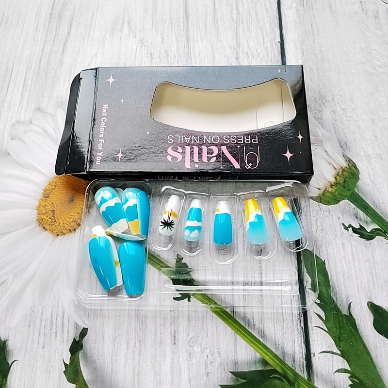 24 Pcs Summer Press on Nails Medium Coffin Square,LINMEIZAI Blue Fake Nails Press ons Beach Waves Nail Tips Glue on Nails Full Cover Acrylic Nail Art Kit False Nails with Coconut Tree Design for Women