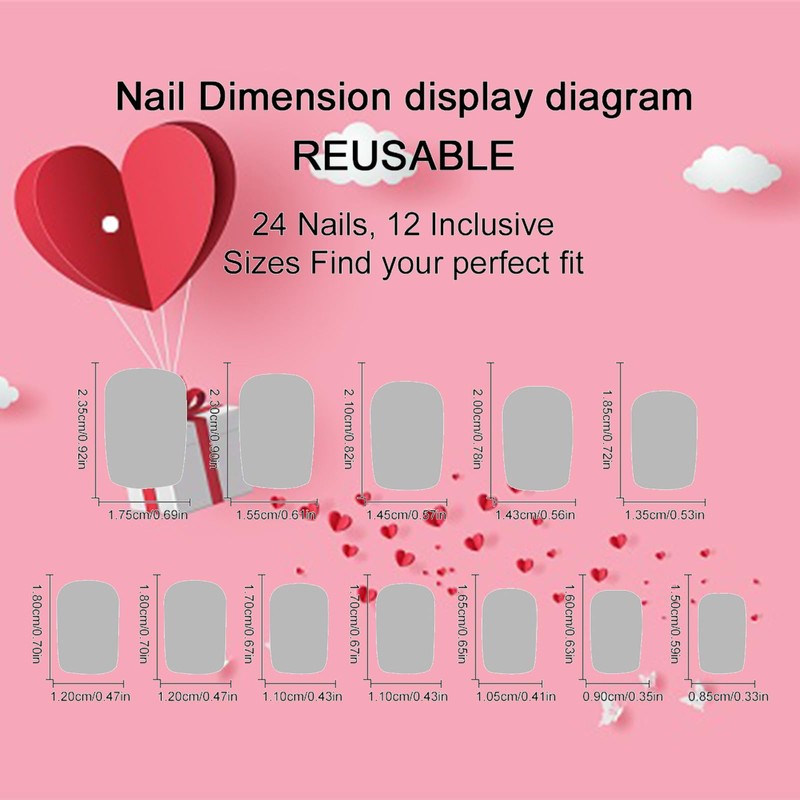 - Fashion for Valentine's Day Nails Manicure:Elegant black love heart press on nails medium square contains 12 sizes, total 24 pcs of Valentines nails. The press on nails brings you salon-like and more time saving stylish black love heart designs. With just builder gel, you can get stylish and beautiful Valentines nails in a few simple steps