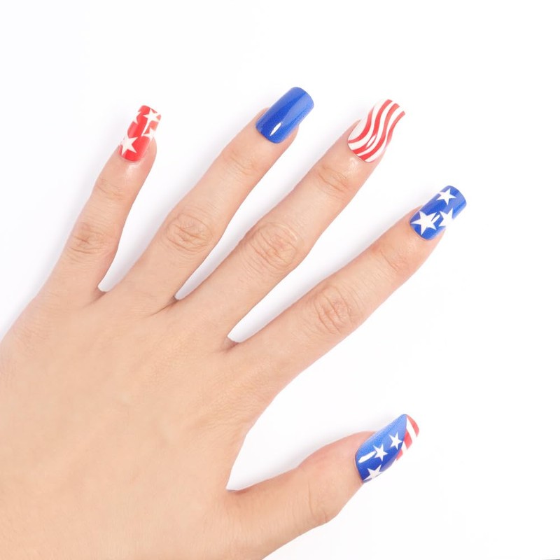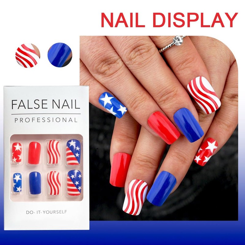 24-piece press-on false nails set, Short glossy American Independence Day five-pointed star blue red stripe false nails, wipe strip, Jelly glue, and 24 Fake Nails (16)
