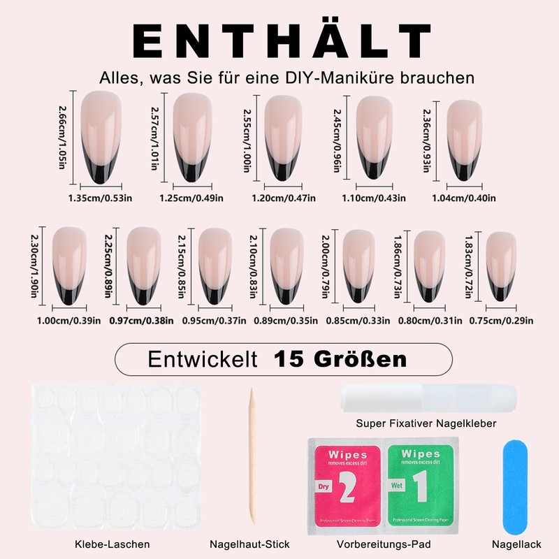 - ¡Veinticuatro uñas, doce tallas cada una aseguran un ajuste perfecto para todos, y también le ofrecemos accesorios adicionales por si acaso! Cada grupo está equipado con una caja de almacenamiento, pegamento de uñas y cortauñas de doble Cara.