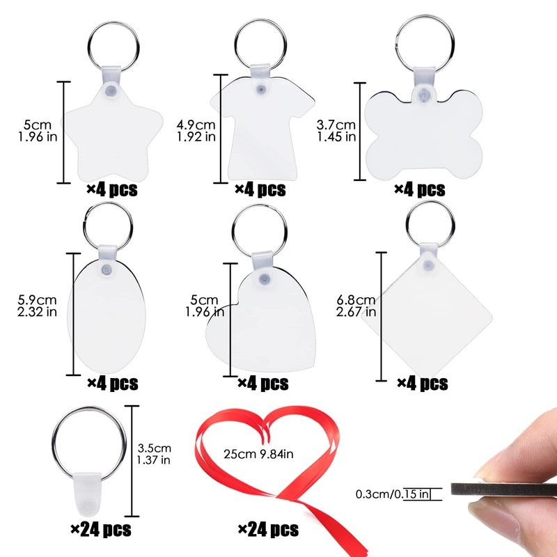 - DIY blank key ring making kit: the sublimation ornament blank set contains 24 sublimation key ring blanks, 24 key ring rings and 24 plastic connectors. Includes 6 different meaningful shapes, star, square, heart, cobblestone, t-shirt and bone. Unlike others, you will also receive 24 red ribbons. The rich shapes and accessories provide much convenience for DIY keychains and festival ornaments.