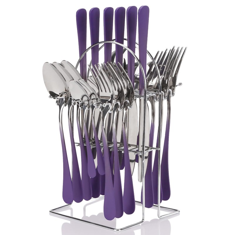 24 Pieces Flatware Set, Stainless Steel Cutlery Set with Silverware Holder, Modern Eating Tableware Set Includes Dinner Knives Forks Spoons,Hanging Silverware Set Service for 6 (Purple)…