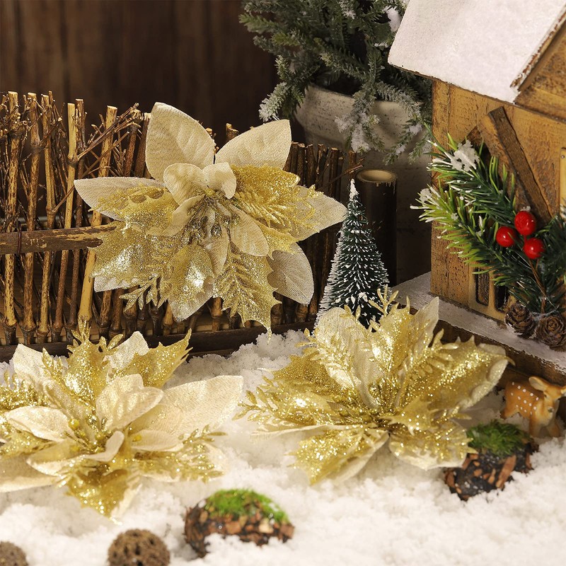 24 Pieces Poinsettia Christmas Decorations Glitter Poinsettia Flowers 5.5 Inch Poinsettias Artificial Christmas Flowers for Christmas Tree Ornament Party Decorations Wreath Garlands(Gold)