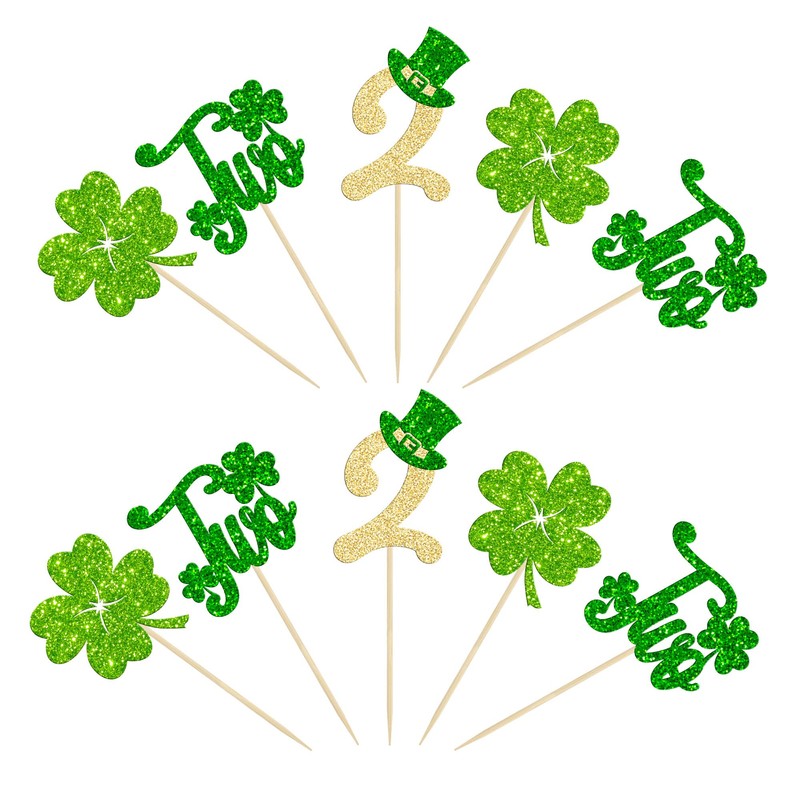 24 piezas de la suerte de dos magdalenas de la suerte para decoración de cumpleaños de San Patricio para decoración de cumpleaños con temática de tréboles, día irlandés, baby shower, suministros de segundo aniversario