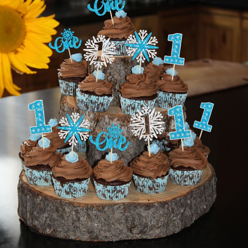 24 piezas de un copo de nieve para magdalenas, copos de nieve de invierno con purpurina azul, decoraciones para tartas de primer cumpleaños, para el país de las maravillas de invierno, suministros para fiesta de primer cumpleaños