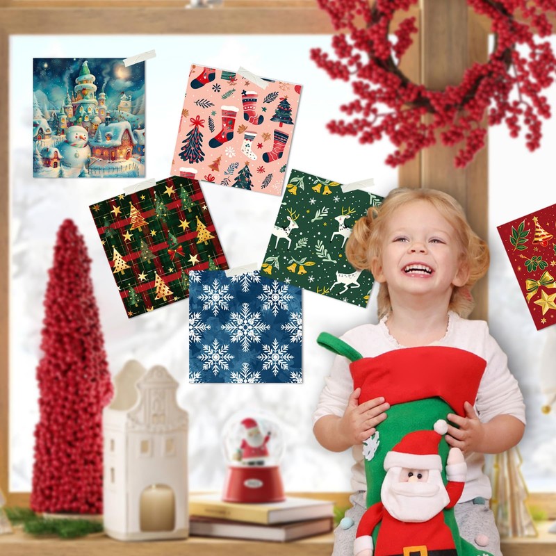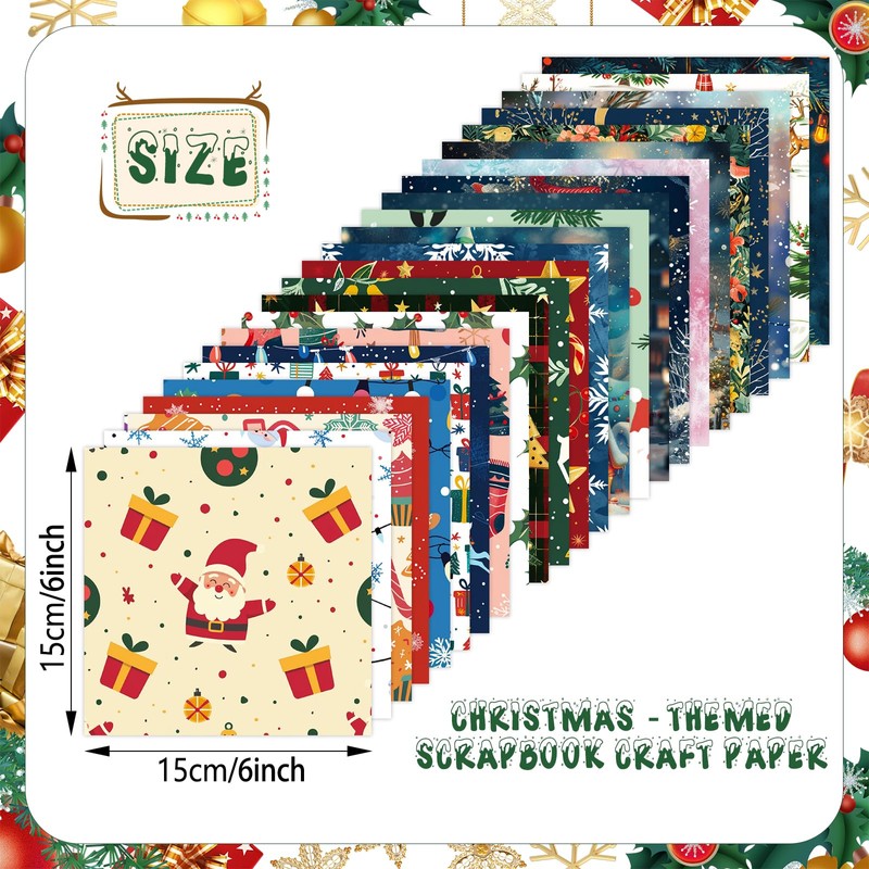 - đ đ ăChristmas Theme Patternsă - These Christmas scrapbook paper are printed in Christmas themed patterns - such as Santa Claus, snowman, reindeer, Christmas tree, berries, snowflakes, gingerbread man, candy house, sled, socks and gift box, each sheet of paper is designed in Christmas styles, shows a lovely and adorable effect, can be nice addition to your Xmas crafts decorations.