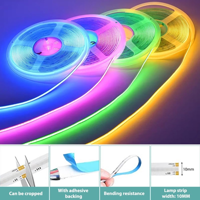 - RGB COB LED strip: 24 V COB LED strip, 5 m with a total of 2880 LEDs (576 LEDs per metre), 15 W/m. Compared with the 5050 RGB LED strips, the RGB COB color changing LED strip has no dark spots, which ensures smoother and brighter linear lighting. (Note: bright spots appear when the brightness is very low). Only work in a 2.4G network, unsupported 5G network.