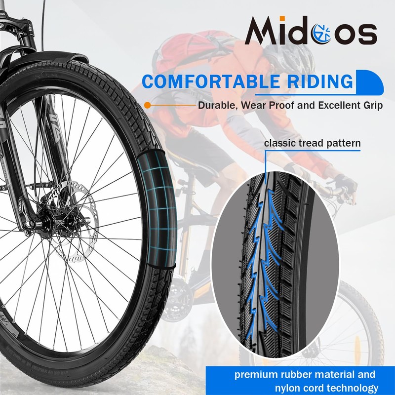 - 【High-Quality Bike Tires】Our 24 x 1.75'' bicycle tires are crafted from high-density rubber and feature nylon cord technology, ensuring excellent toughness and abrasion resistance. Classic tread pattern in middle and on side not only provides more traction and great grip during climbs and turns but also offers superior water drainage, making them suitable for various riding environments.