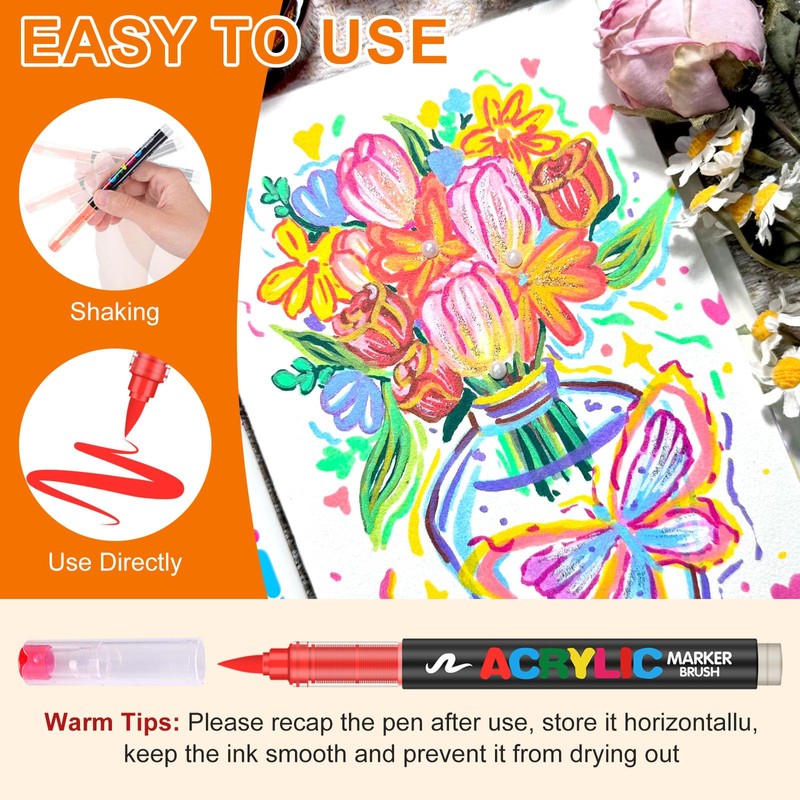 - 1-5mm Brush Tip for Precision and Versatility: Designed with a 1-5mm brush tip, these acrylic paint pens provide you with the flexibility to create both detailed designs and broad strokes. Use them as soft tips paint markers for intricate details or brush acrylic paint markers for larger areas. Whether you're painting on canvas, wood, or rocks, these markers are perfect for all artistic techniques.