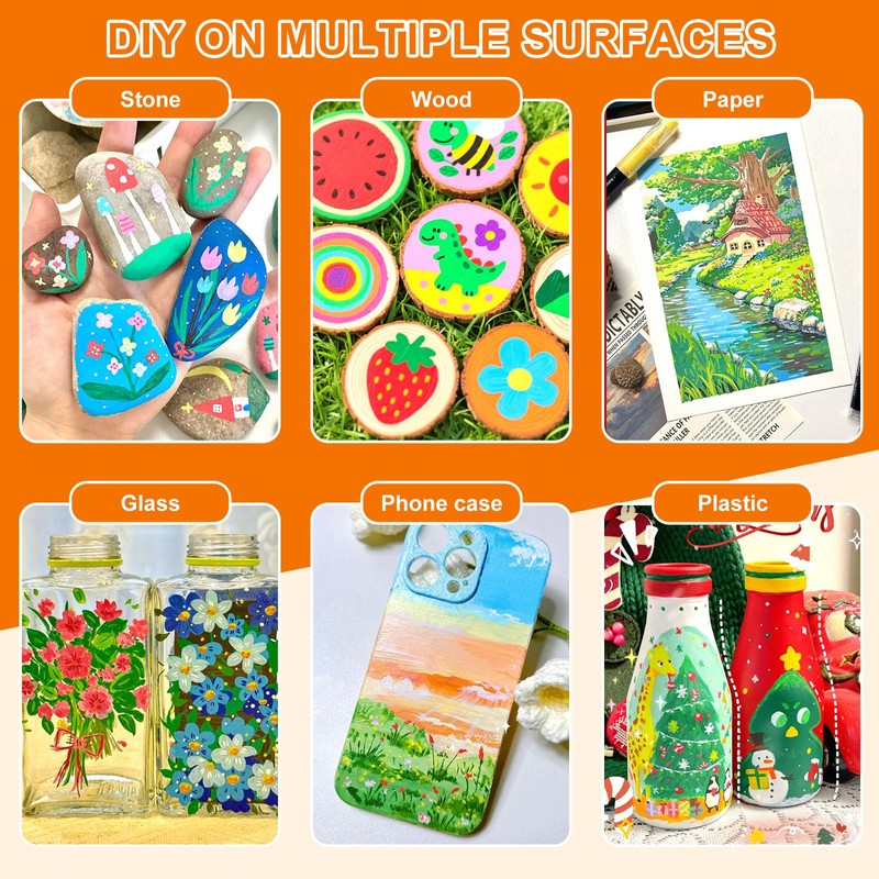 - Versatile for All Surfaces: These acrylic paint pens work on a variety of surfaces, from rocks and canvas to wood, plastic, and even fabric. Whether you’re designing custom wood crafts, painting vibrant rock art, or adding details to a canvas painting, these paint markers for wood and other surfaces give you smooth, even coverage. The brush tip acrylic paint markers are great for both broad strokes and intricate designs, making them perfect for any project.
