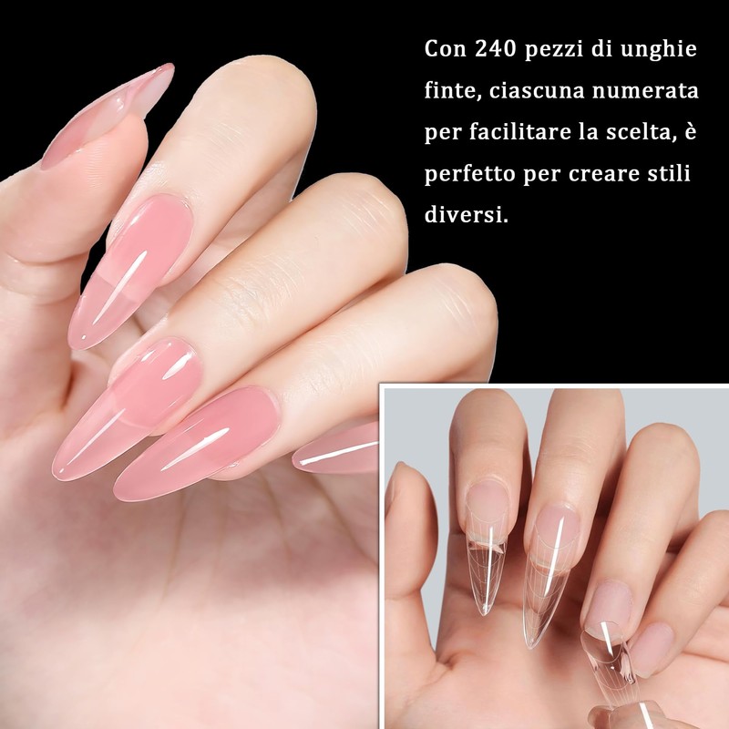 - WIDE RANGE OF APPLICATIONS Our set offers wide versatility, suitable for different needs. With 240 false nails, each numbered to make it easier for you to choose. Perfect for different styles. Made of high quality materials, the nails adapt to the size and shape of your fingers, ideal for professional manicures and anyone who loves nail art.