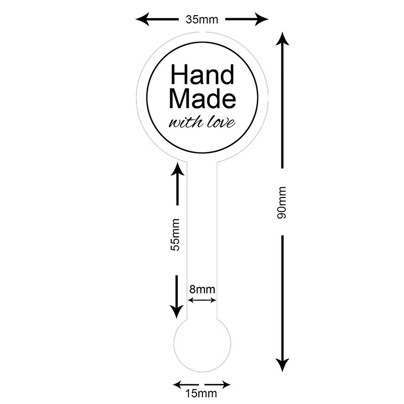 These are 35mm wide and 90mm tall. These are a beautiful and simple design, our stickers are all white background with “hand made with love” in black.