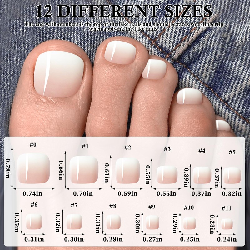 - Multiple Sizes for a Perfect Fit: Ombre feet pedicure kit includes a comprehensive variety of sizes to accommodate different toe shapes and lengths. Ombre nails for toes ensure a snug and comfortable fit for everyone, regardless of whether you have wide, narrow toes. Whether you're looking for ombre false toenails press on nails women to enhance your natural look or to cover imperfections, ombre stick on toenails for women covers all bases. The wide range of sizes means that every toe can be perfectly adorned, ombre fake toenails with glue suitable for all foot types.