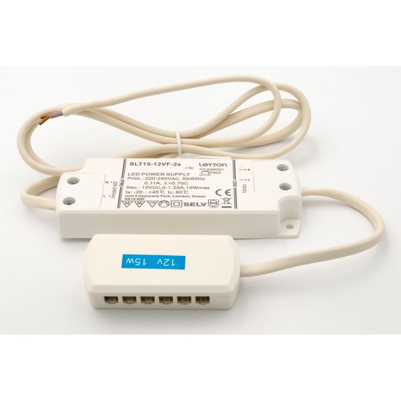 Driver for LED fittings to convert mains voltage 240v circuit to low voltage 12v. Suitable for 0.7W - 15W energy consumption with Wattlite 'Flat' and 'Flexible' ranges. Comes with 2 metre cable on input and 6-way AMP socket on output. Includes integrated auto reset, electronic short circuit protection and overload protection.
