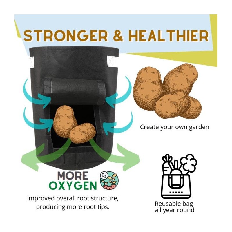 - [EASE OF USE]: The potato fabric pot features a harvest window to easily monitor and harvest your potatoes. The handles provides easy mobility when filled with soil. The fabric provides an automatic pruning system for a healthy fibrous root system while preventing roots from circling to its death AKA root bound or pot bound.