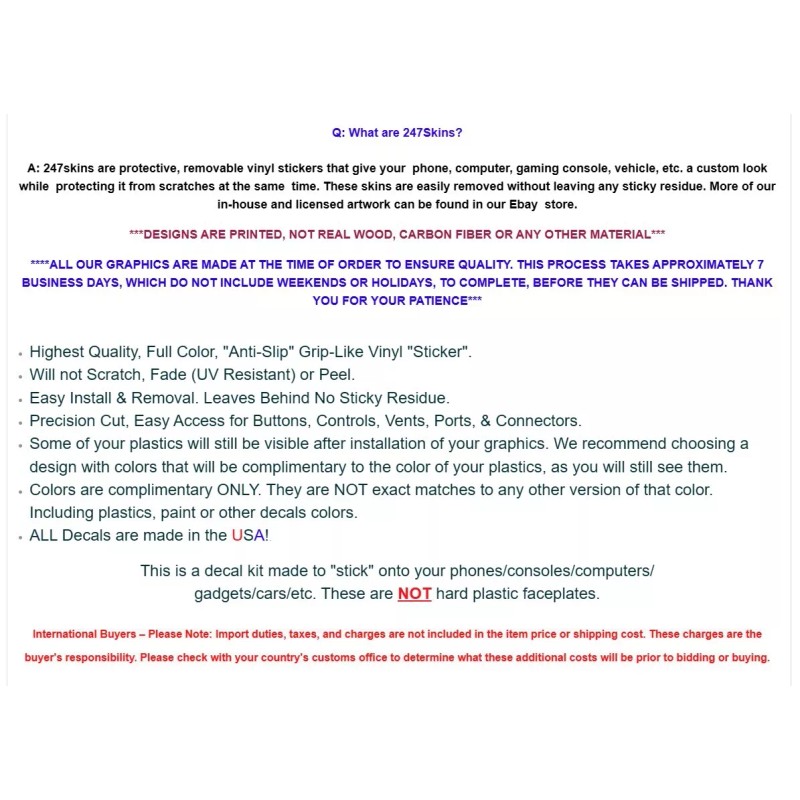 A: 247skins are protective, removable vinyl stickers that give your phone, computer, gaming console, vehicle, etc. a custom look while protecting it from scratches at the same time. These skins are easily removed without leaving any sticky residue. More of our in-house and licensed artwork can be found in our Ebay store.