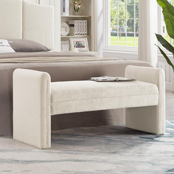 24KF Modern Boucle Teddy Lovely Bench, Upholstered Bed Bench Entryway Bench Ottoman with Armrest -Cream