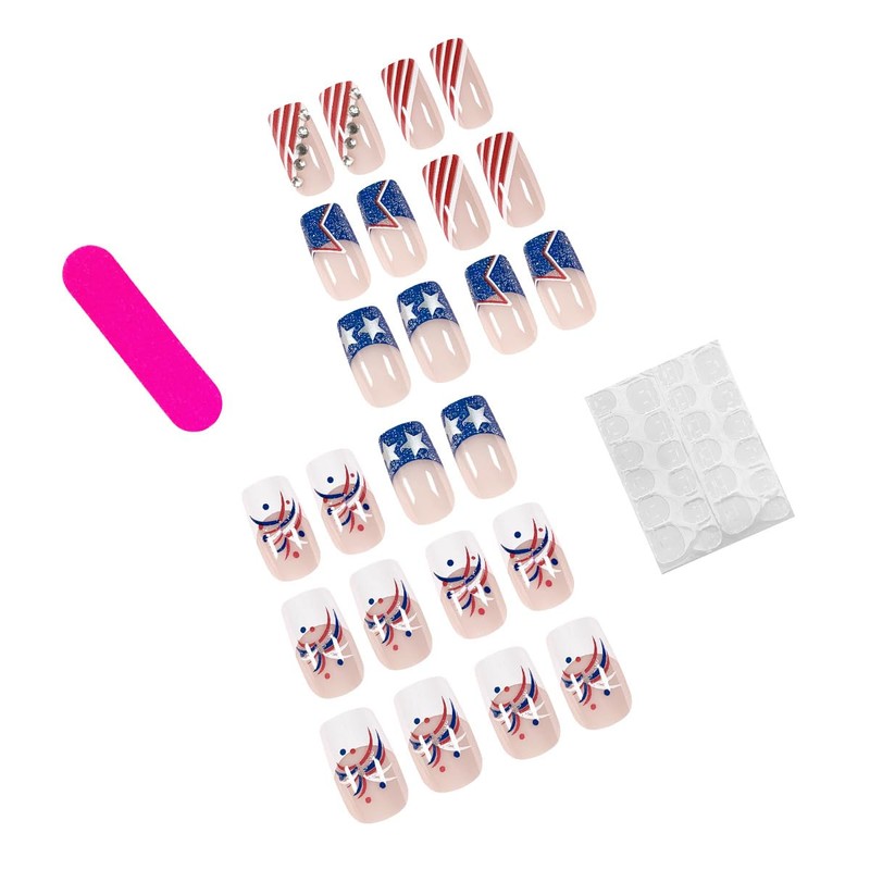 - Package: You'll get 24 pieces independence day press on nails medium square,1 mini nail file, 1 small wooden stick, 24 grain jelly glue.It is convenient for you to decorate your nails easily and conveniently in your daily life