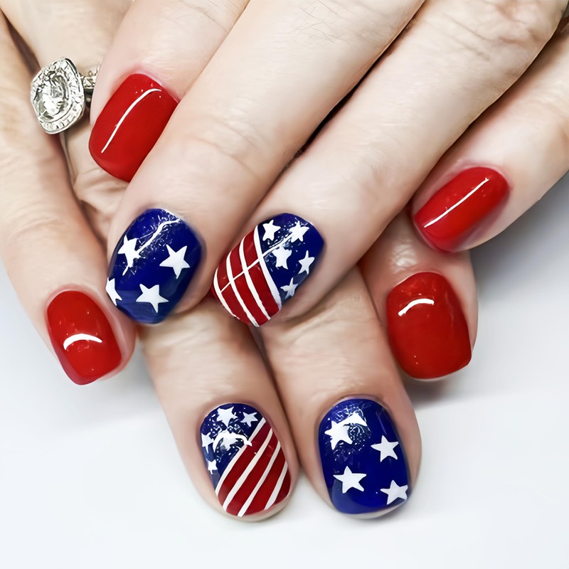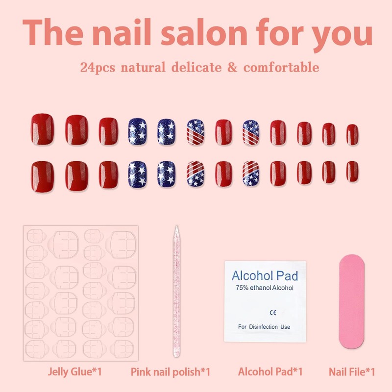 - Package About:4th of July flag false nails.The package contains 24 Pieces of short square press on nails of different sizes,1 mini nail file,1 crystal stick,and 24 pieces Jelly Glue Stickers.You can safely choose a fake nail that fits your finger size