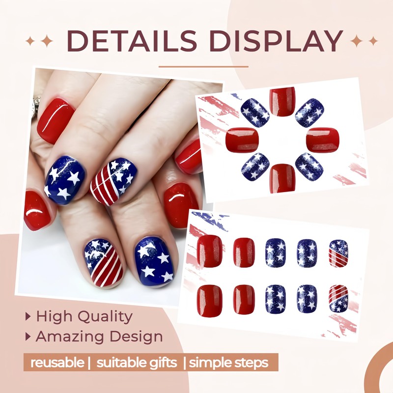 - Easy to Use: The cute Independence Day flag fake nails are easy to trim. It only takes 5 minutes to get your favorite fake nails. A few simple steps will make it easy for you to get the effect of doing a nail salon at home