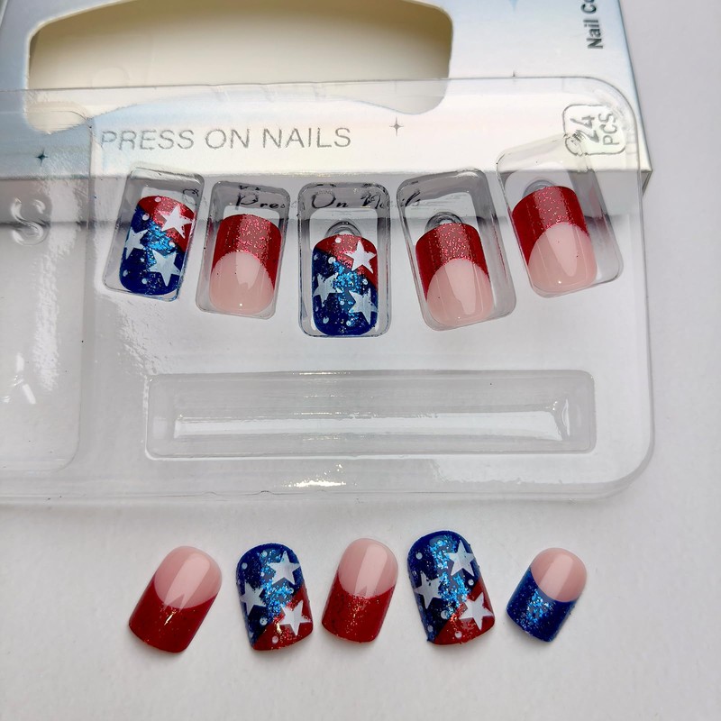 - Package Contents: Package with 24pcs Independence Day press on nails with red blue glitter french tip design,24pcs jelly glue stickers,1pc nail file,1pc wooden stick.Difference sizes artificial nails can repeated use,you can trim it to any length you want,no need to buy other things,you can get acrylic press on nails