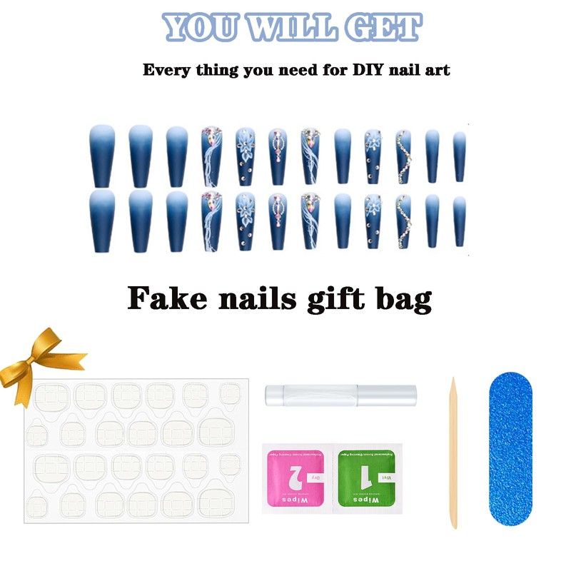 - 💖【Long Fake Nails Pack】24 pcs/12 Sizes long nails, 1 nail file,1 stick of glue, 24 pcs jelly glue. 1 Cleaning Cloths,1 wooden stick.(Durability of jelly glue is not as good as liquid glue, but it makes fake nails Reusable,Please use suitable glue according to different scenes)
