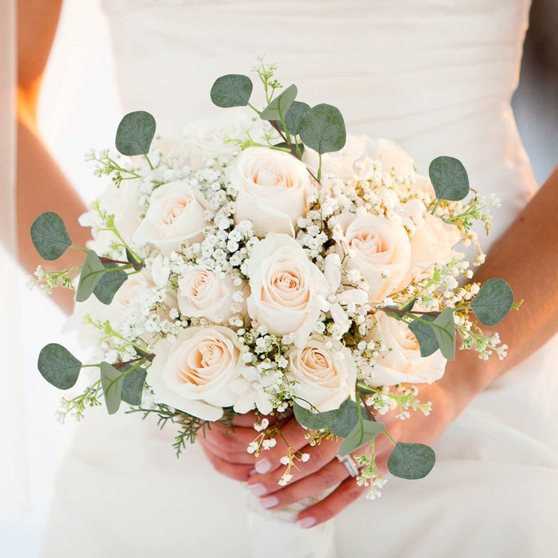 • Quantity: Each pack of 24 artificial eucalyptus leaf stems with artificial white seed plants.