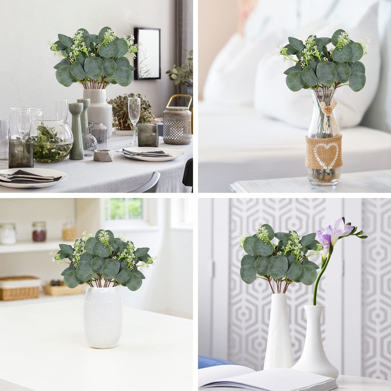• Creative: Artificial eucalyptus plants imitate real eucalyptus, no need for sunlight, watering, or pruning, artificial eucalyptus leaf stems can be used to make green wreaths, and artificial floral arrangements. Wedding bouquets, wedding decorations, or decorating dining tables, desks, etc. All these artificial seed green leafy eucalyptus stems and branches offer more natural possibilities in your life.