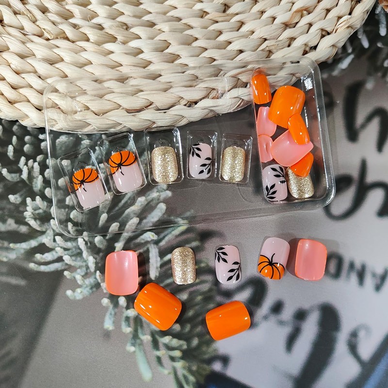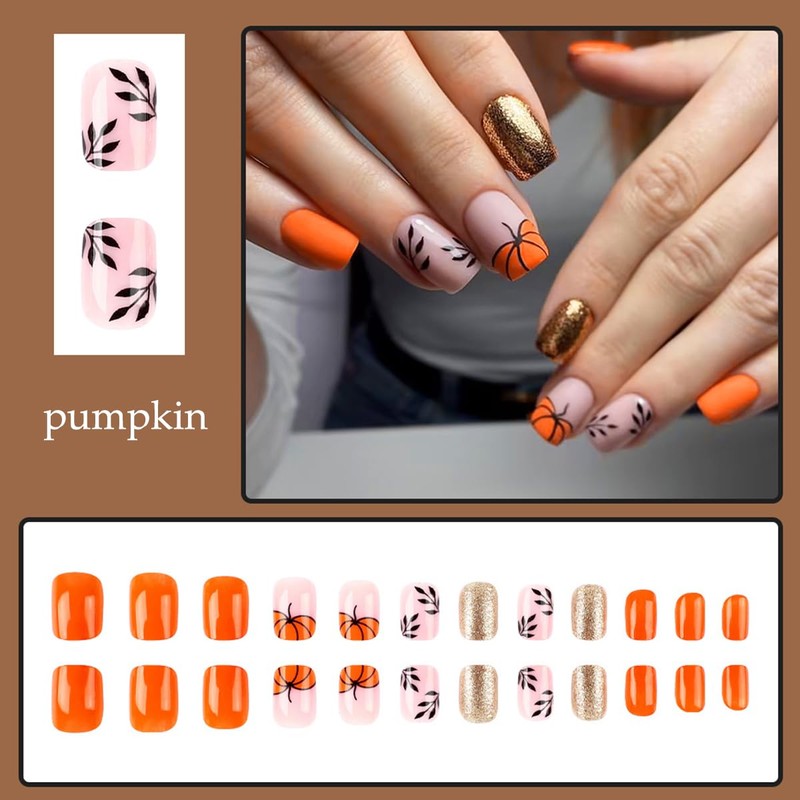 - Fall Nail Design: Autumn false nails with pumpkins leaves designs, glitter nail art effect, cute pumpkin nail tips, very suitable for DIY autumn and halloween nail art