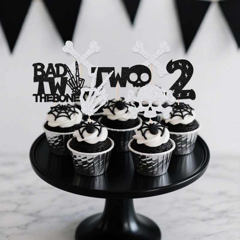 24PCS Bad Two The Bone Cupcake Topper Bad Two the Bone Party Decorations for Boy Girl Rock Themed Happy 2nd Birthday Party Decoration Supplies