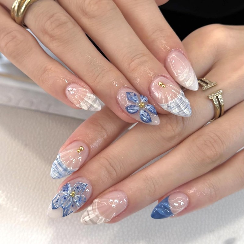 24Pcs Blue Flower Press on Nails Medium Almond Nail French Fake Nails with Blue Wave Beach Nail Art Almond Shaped Stick on Nails Summer False Nail Handmade DIY Set for Women