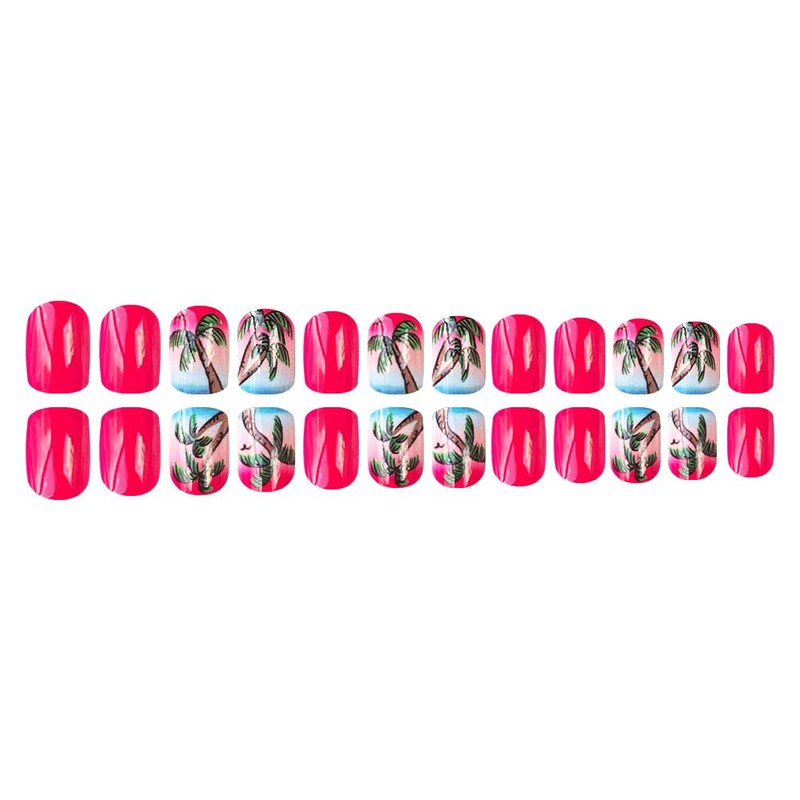 24Pcs Blue Pink Summer Press on Nails Square Short Fake Nails with Coconut Trees Designs Cute Gradient Artificial Glue on Nails Full Cover False Nails Reusable Acrylic Nail Kit for Women