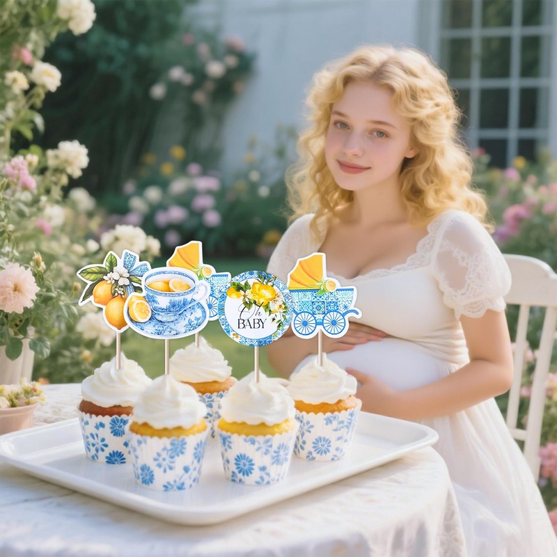 24Pcs Blue White Tiles Lemon Oh Baby Cupcake Topper Sweet Fruit Theme Summer Lemonade Cupcake Picks for Baby Shower Party Decorations