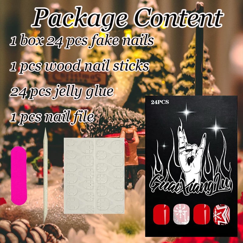 - Xmas Nails Set :24Pcs Christmas Press on Nails +1 Nail File + 24Pcs Jelly Glue Stickers+1 Wooden Stick.Durability of jelly glue is not as good as liquid glue, but it makes snowflake fake nails reusable