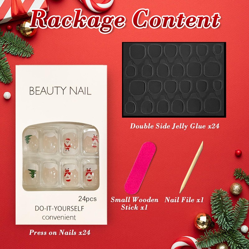 - 【Manicure Kit】A box contains 24pcs Christmas false nails in 12 different sizes, allowing you to select the fake nails that perfectly fit your finger size and create the nail shape you desire. It also includes 24pcs jelly glue stickers, 1 mini double-sided nail file and 1 small wooden stick, don’t need to purchase anything else, providing everything you need for a fashionable nail salon experience.
