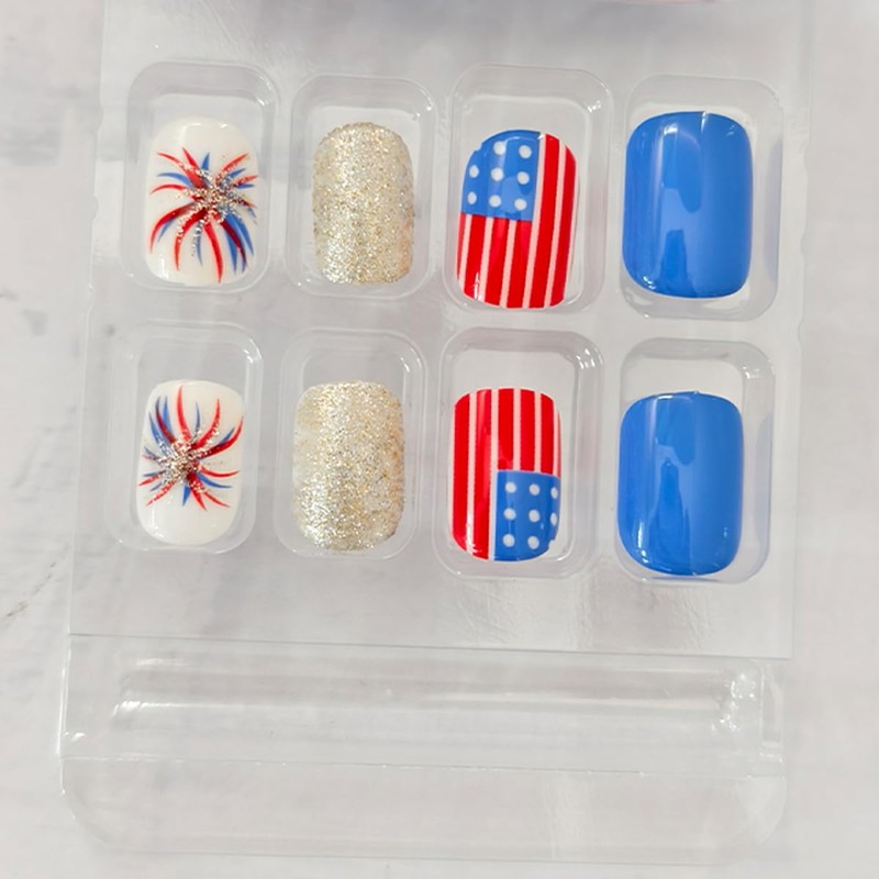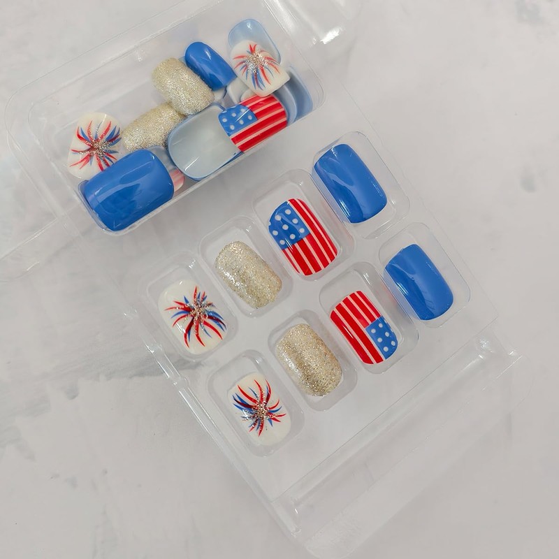 - Short Nails Kit: These red white blue American flag fake nails with fireworks glitter design, perfect for Independence Day and various patriotic events