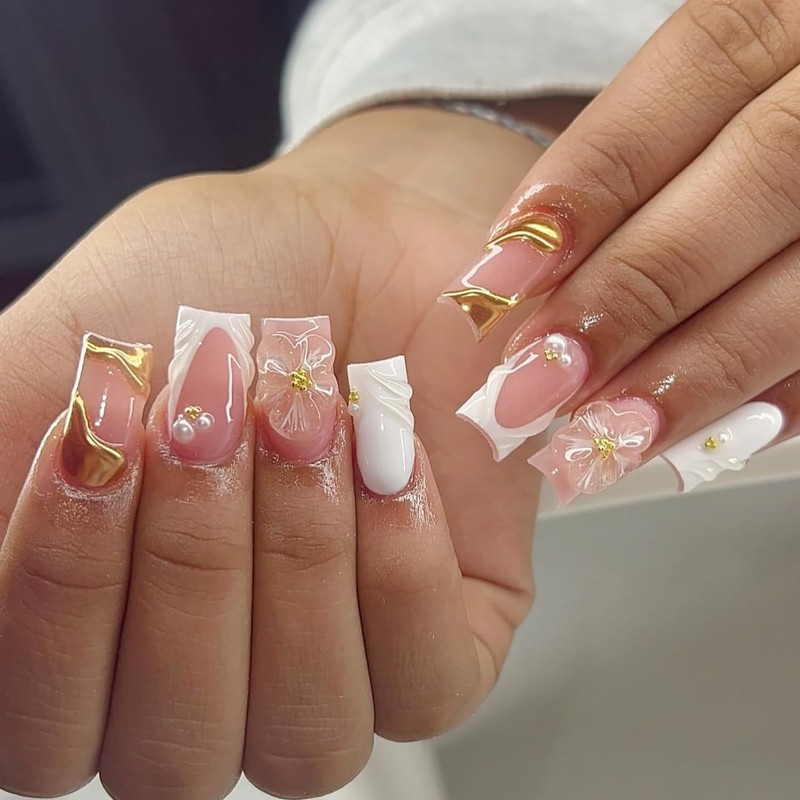 24Pcs Flower Press on Nails Medium Square Fake Nails with 3D Flower Water Ripple Designs Glossy Nude Pink Stick on Nails White Gold French Tip False Nails for Women Spring Summer Manicure Art Supplies