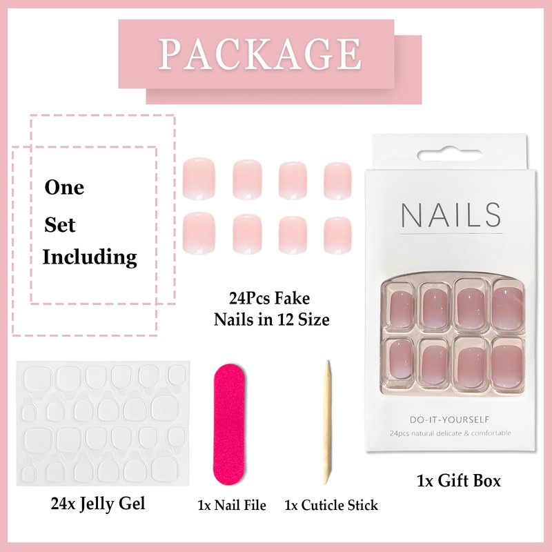 24* False nails + 24* Jelly glue + 1* Nail file + 1* Cleaning stick