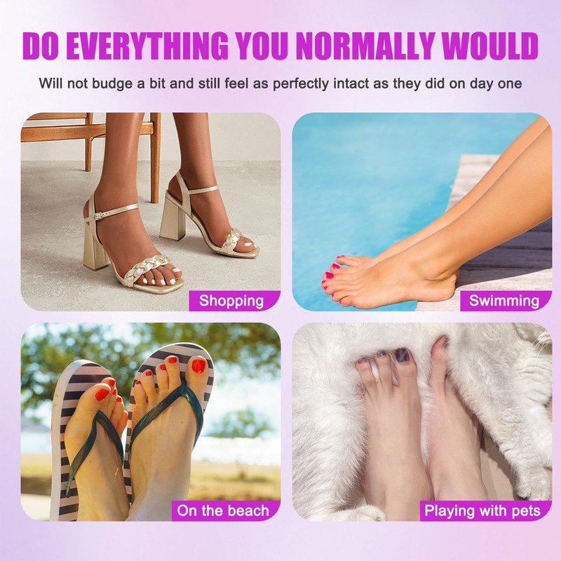 - Vibrant Summer Styles: Our fake toenails come in a variety of trendy summer designs, from soft nudes and elegant French tips to bright colors and playful patterns. Whether you're getting ready for a beach vacation, a summer wedding, or a night out, there's a style to match every outfit and occasion. Express your personality with fun, fashionable toes that make a statement wherever you go.