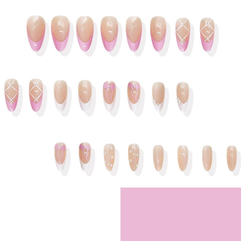 24Pcs French Tip Press on Nails Long Almond Fake Nails Bow False Nails 3D Pearl Pink Bows White Line Design Nude Stick on Nail Cute Full Cover Glue on Nail DIY Salon Manicure Supplies for Women