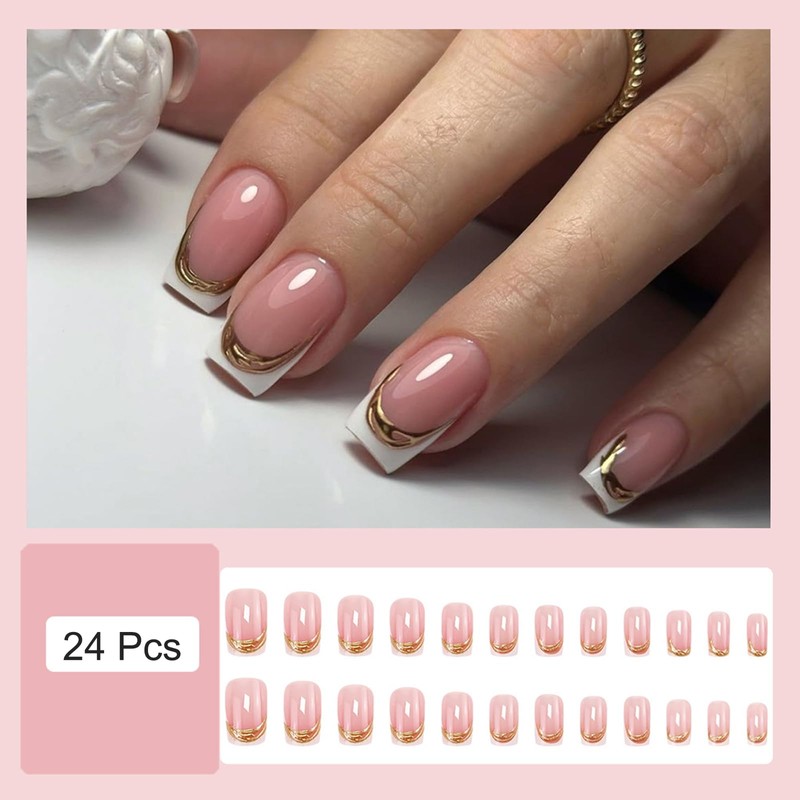 24Pcs French Tip Press on Nails Medium Square Fake Nails White French Nail Tips 3D Gold Nails Press ons Glossy Nude Acrylic Nails Full Cover False Nails Gel Glue on Nails for Women