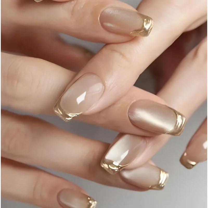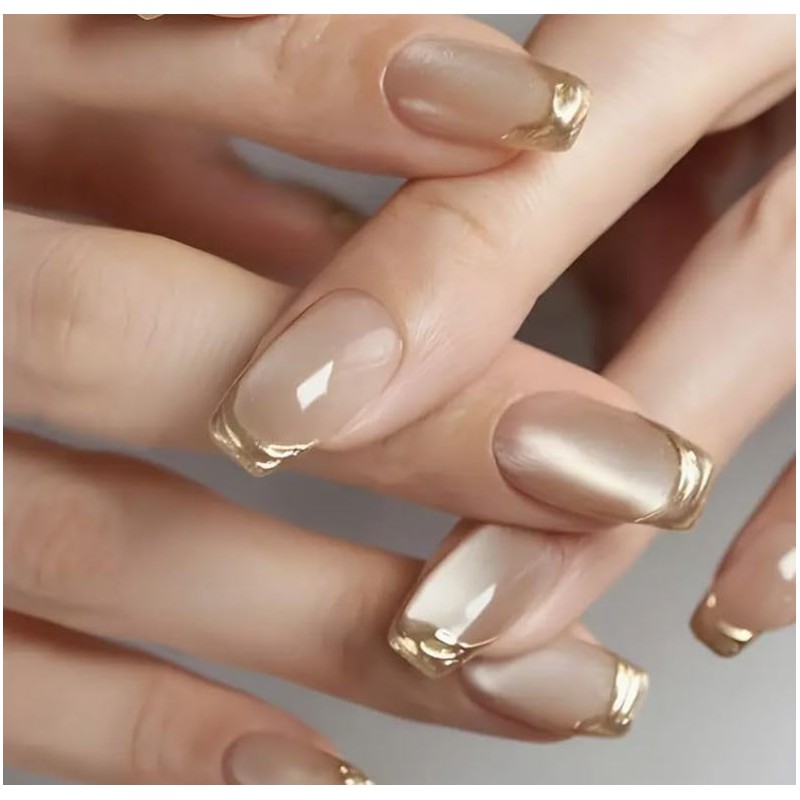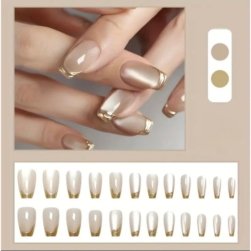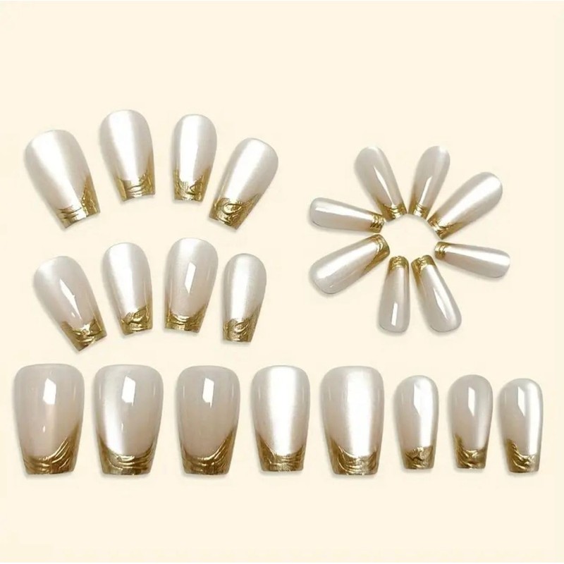 - 💅 24pcs Glossy Press On Nails with elegant Golden Stripe & Glitter Accent