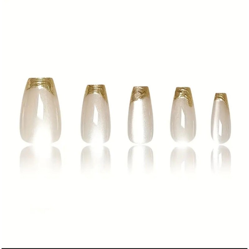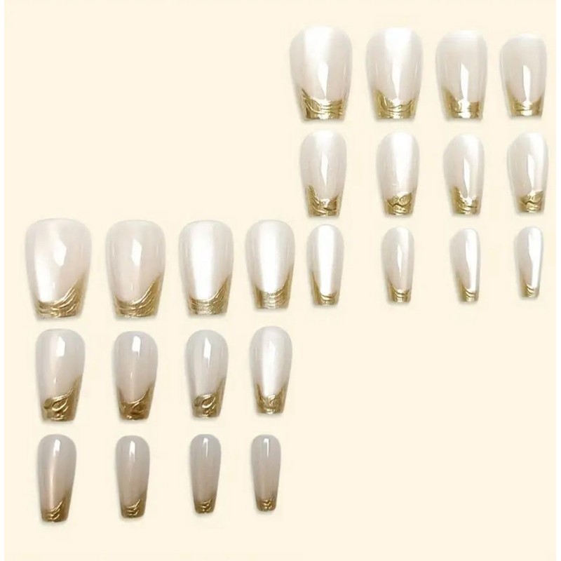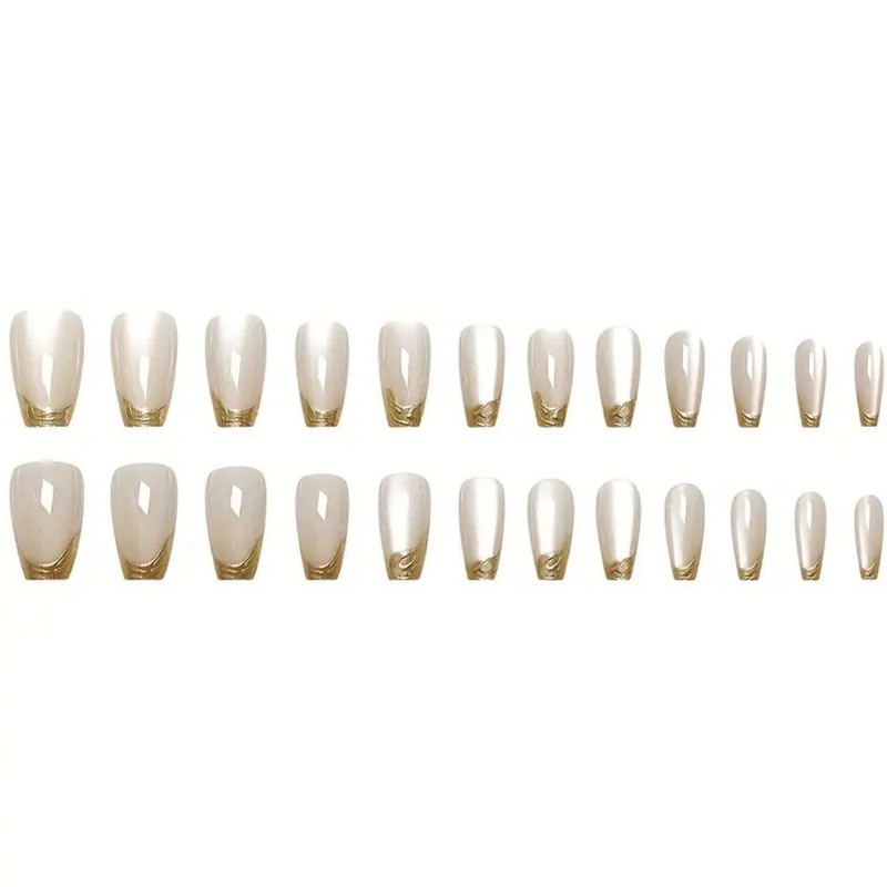 24pcs Glossy Press On Nails – Golden Stripe & Glitter Accents. Designed in a Short-T Ballet Shape with Medium Length