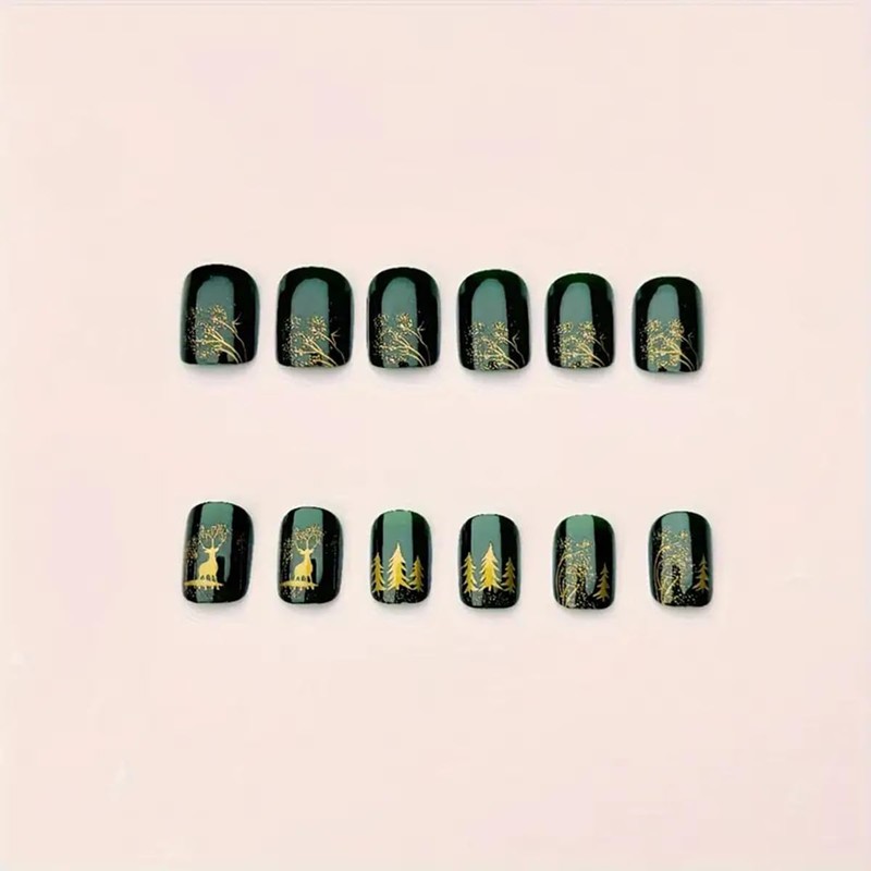 - Nail Art Kits: 24Pcs reusable green Christmas tree elk snowflake stick on nails with glitter design - Short square shape false nails includes 24pcs jelly glue stickers, 1 mini nail file and 1 wooden stick
