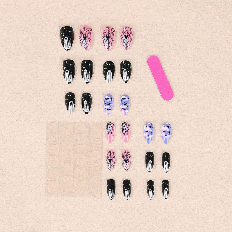 24Pcs Halloween Press on Nails Medium Almond Fake Nails with Ghost Spider Web Designs Full Cover Glossy Acrylic Glue on Nails Cute Halloween Stick on Nails Medium Length Artificial Nails for Women