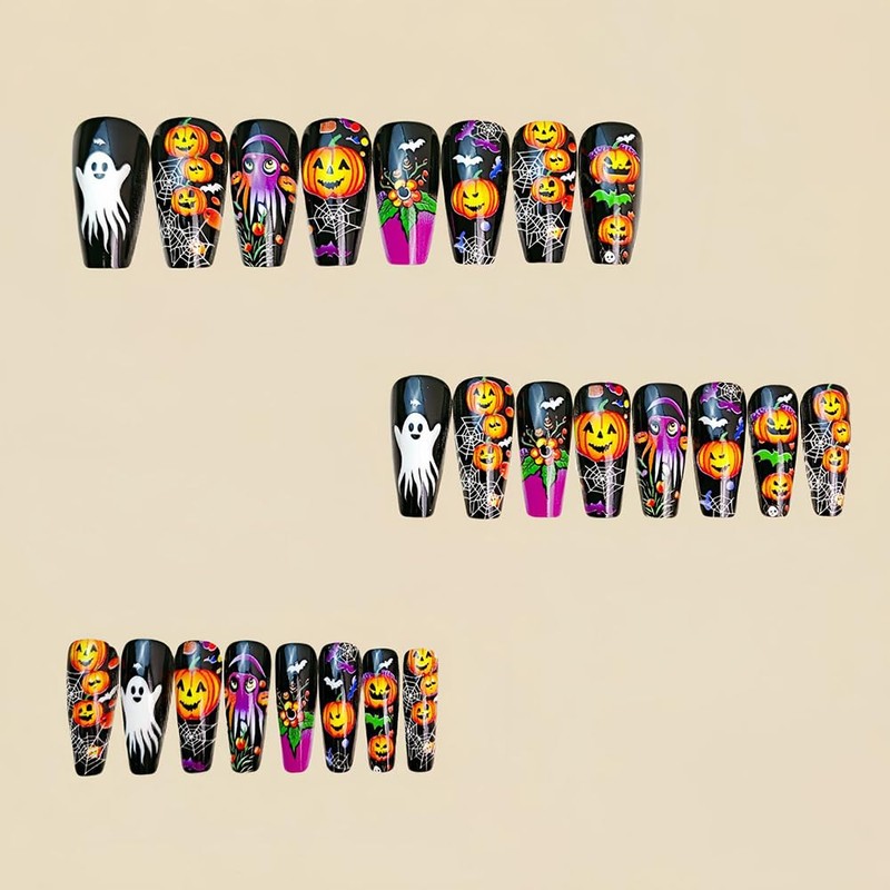 - Halloween Press on Nails:There are 24 halloween square press on nails in one pack,Beautiful and cute press on nails false nails comes with has 12 different sizes,you can chose them to bepolished to the most suitable size,it fits any finger perfectly.