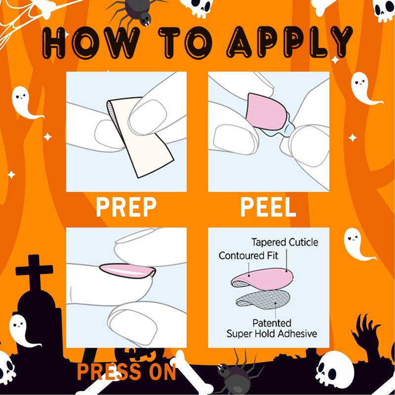 - Easy to use: After trimming and cleaning your natural nails, select the right sizes of our high quality nails and apply our nail adhesive tape on, then press on your nails for 20 seconds. Now you have beautiful halloween nails.