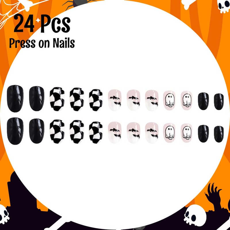 24Pcs Halloween Press on Nails Short Almond Fake Nails with Cute Ghost Designs, Black White Press on Nails Halloween Glue on Nails Full Cover Halloween Nails White Stick on Nails for Women