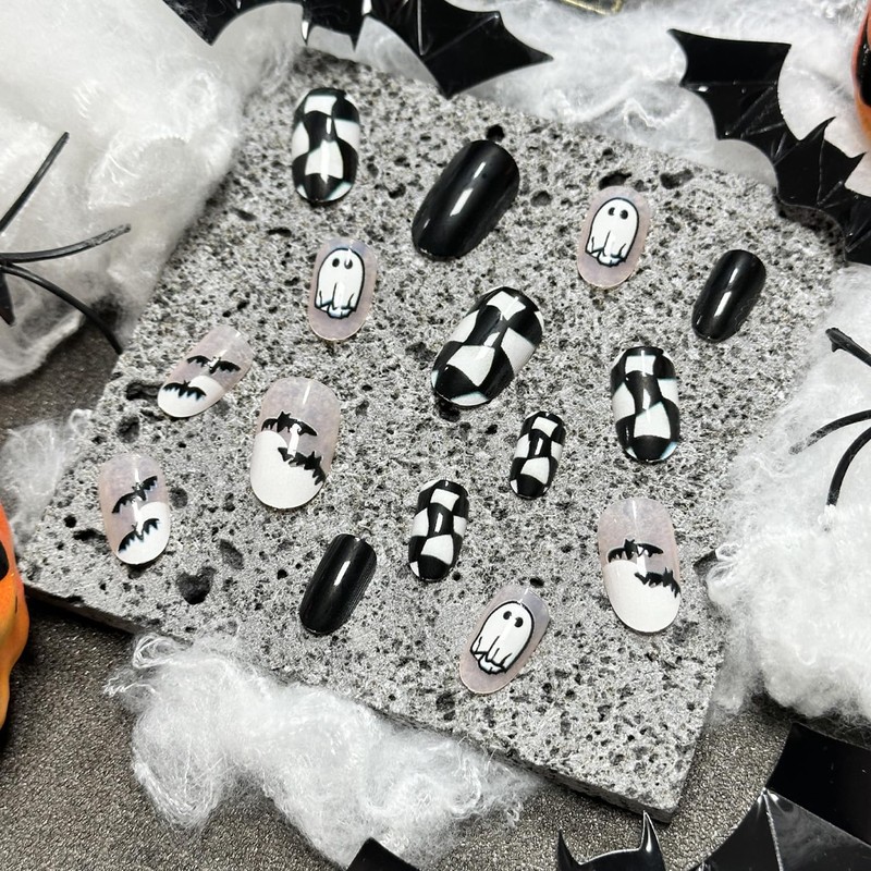 - Halloween Press on Nails: Halloween almond press on nails with cute ghost, bat pattern make you look more charming. Easy to create a Halloween happy atmosphere during Halloween time.