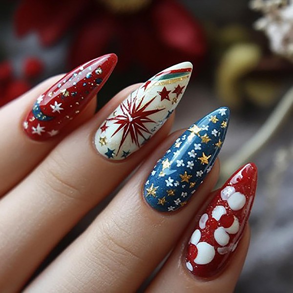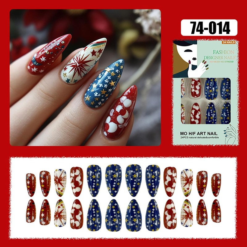 - Independence Day Fake Nails Design: Our July 4th Independence Day acrylic nails use fireworks gold stars pattern design, very suitable 4th of July maniure decoration ,the same as add a festive patriotic atmosphere